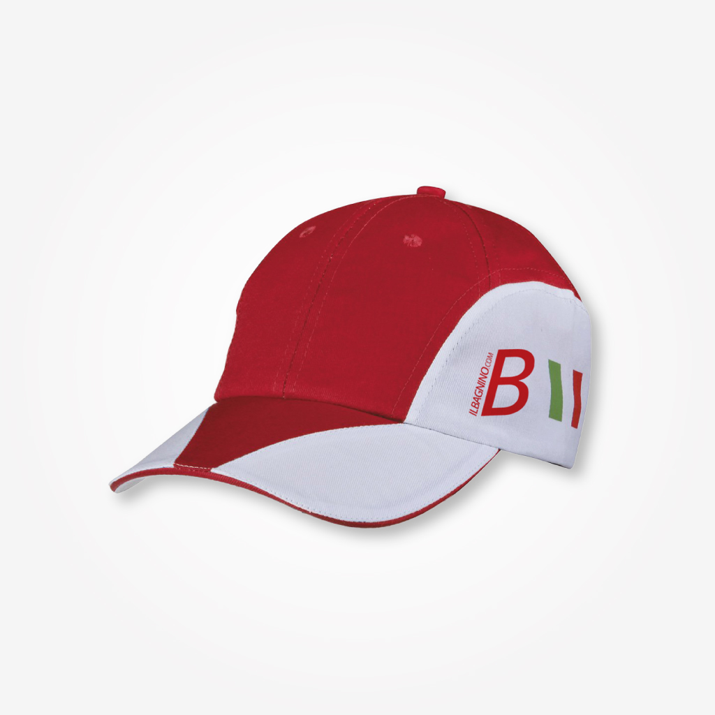 Cappellino bicolore sandwich in cotone 100%, con visiera rigida precurvata con sandwich, tricolore Italiano stampato, chiusura regolabile con velcro.