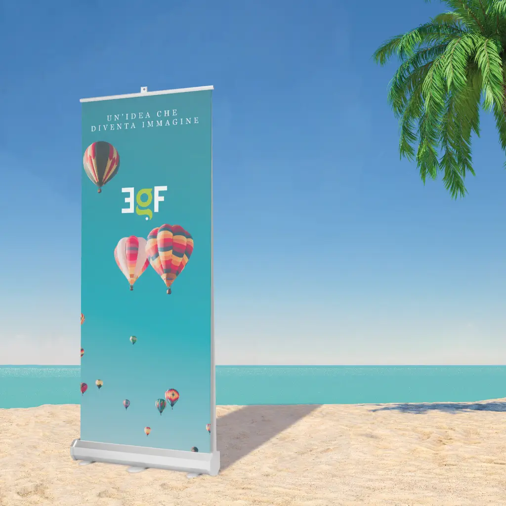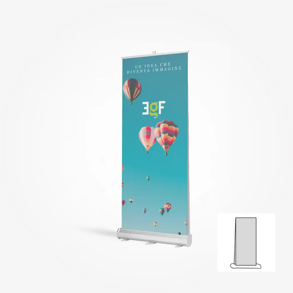 Roll-up bifacciale autoavvolgente in alluminio silver; fissaggio grafica superiore tramite barra con chiusura a pinza, inferiore con biadesivo.