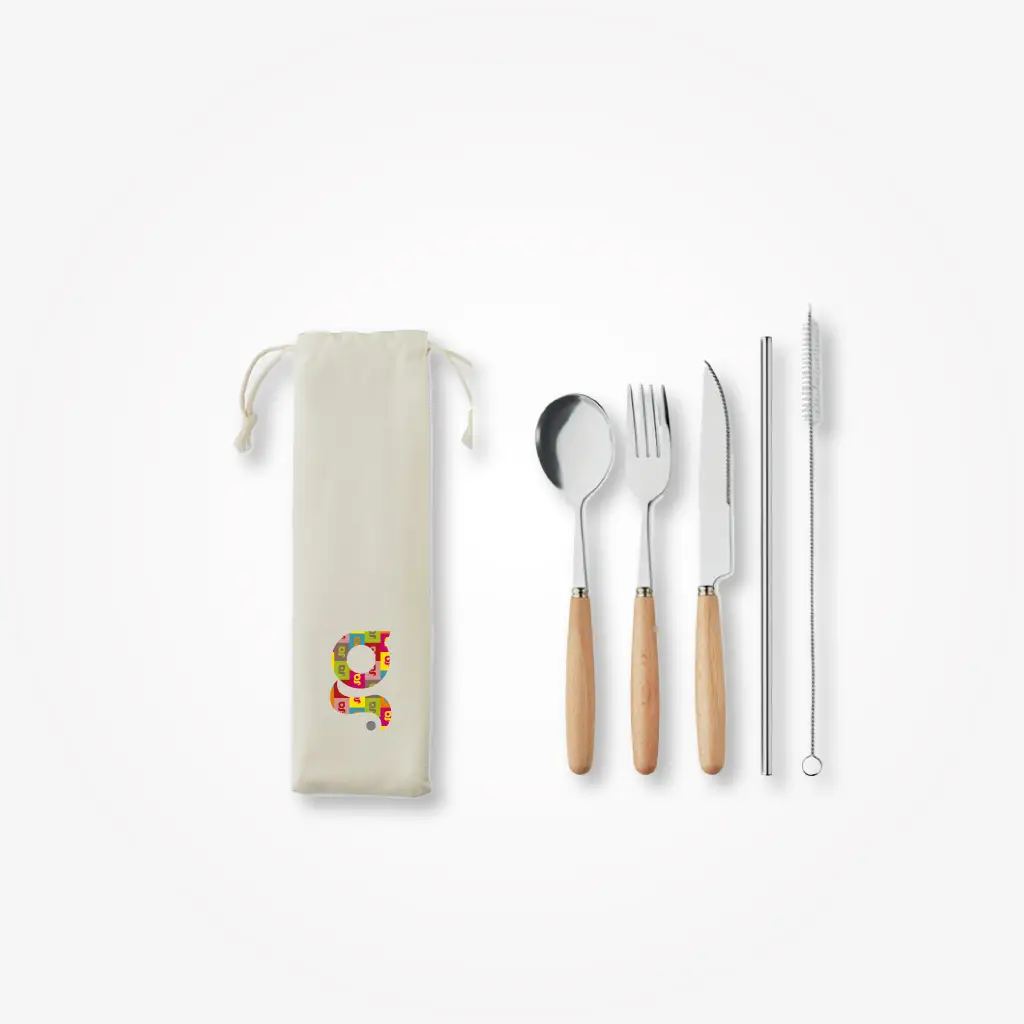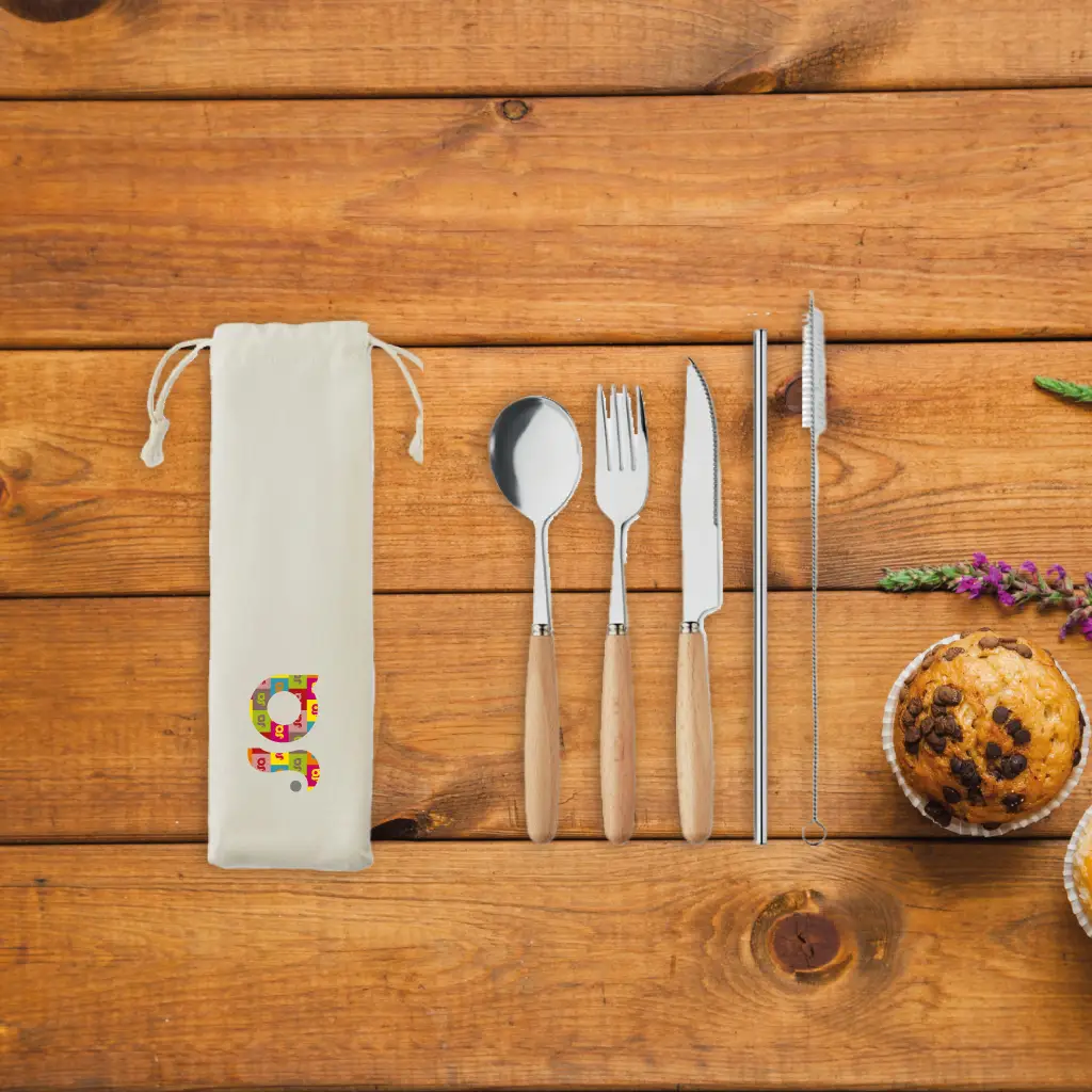 Include coltello, forchetta, cucchiaio, cannuccia in acciaio inossidabile con spazzola.