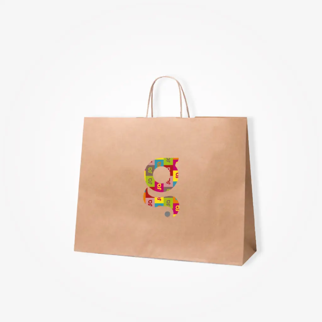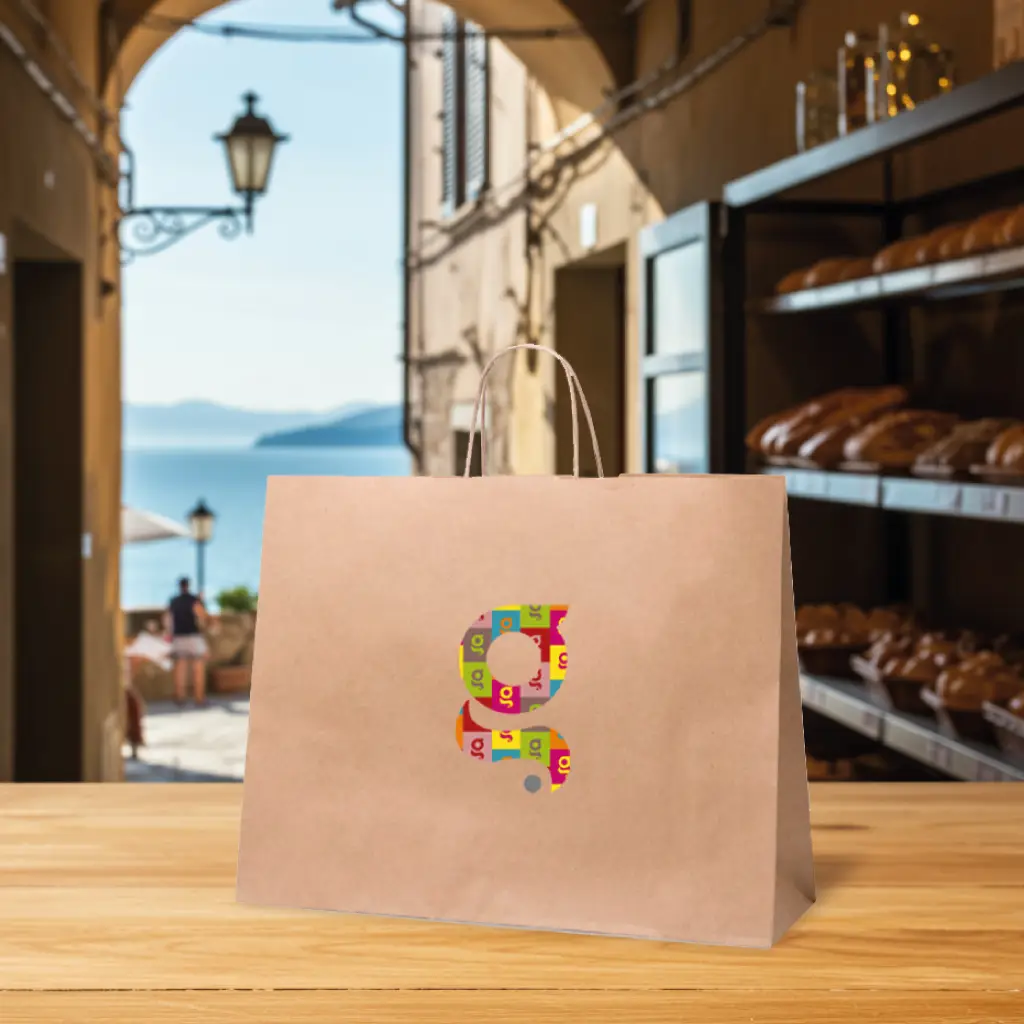 Shopper in carta da 100g/m2 con finitura naturale, manici corti rinforzati e soffietto.