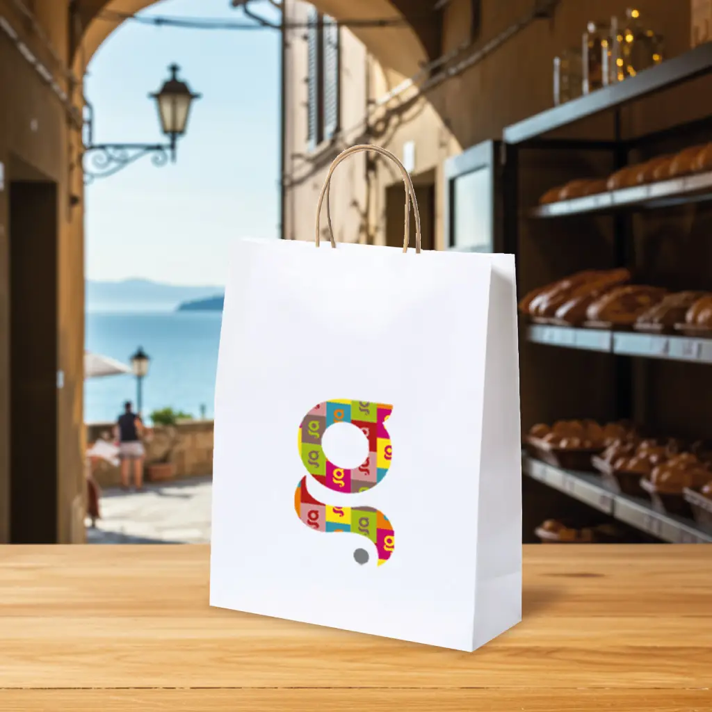 Carta Riciclata 100 g/ m2 in finitura bianca, manici corti rinforzati in colore naturale e soffietto.