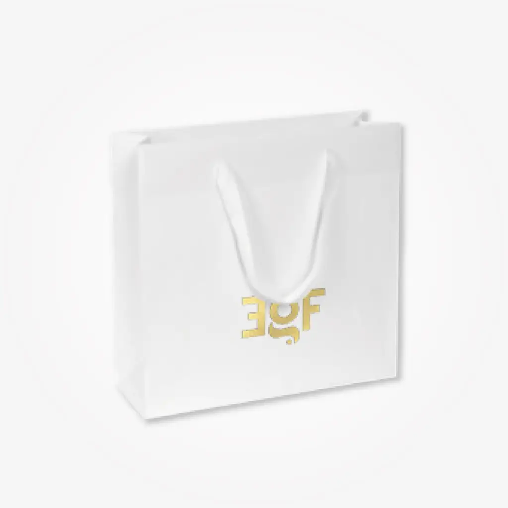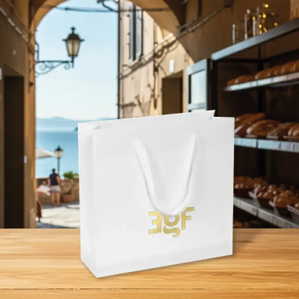 Carta kraft bianco, manici in fettuccia quadra bianca.