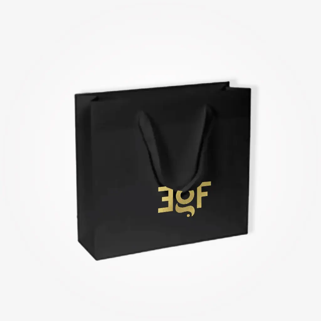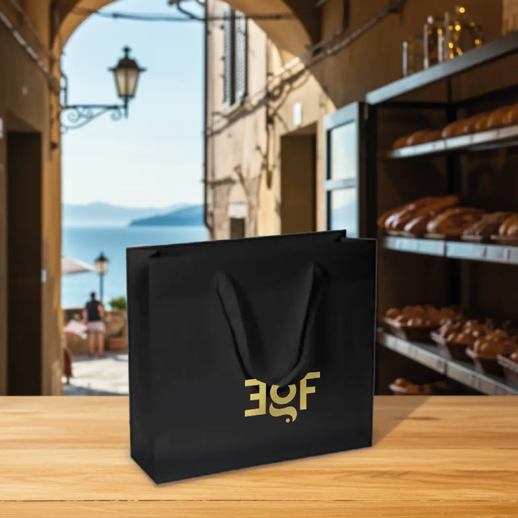 COLORE NERO : carta kraft bianco, stampati nero, manici in fettuccia quadra nera.